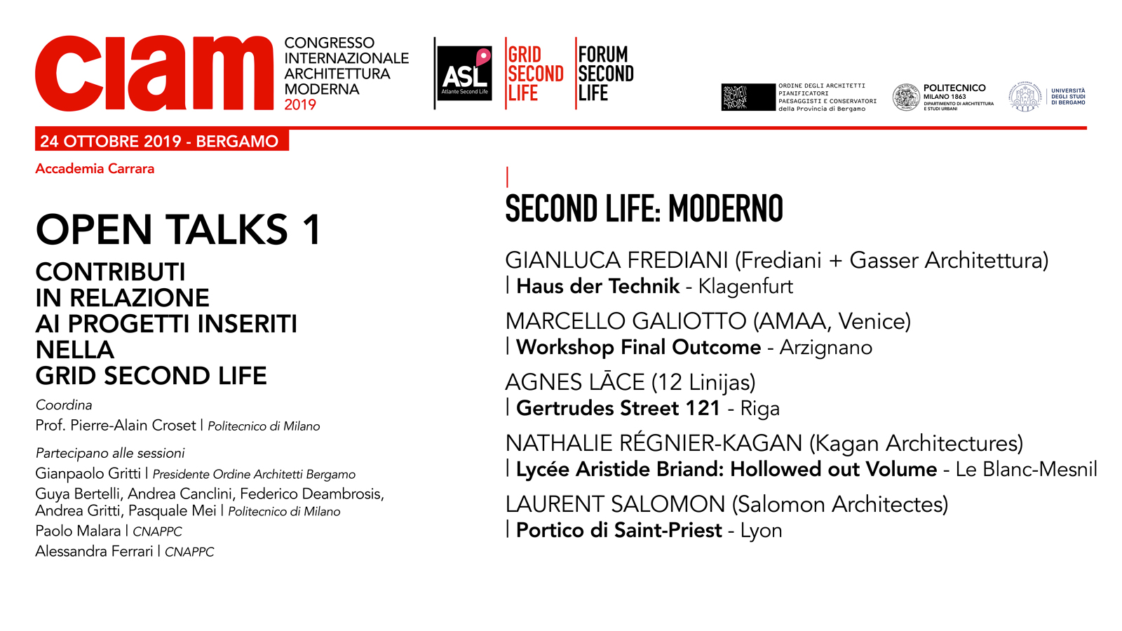 Open Talk 1 | SECOND LIFE: MODERNO | Giampaolo Gritti ( Presidente ordine degli architetti Provincia di Bergamo) Pierre Alain Croset ( Politecnico di Milano), Agnes Lace (Riga), Nathalie Régnier-Kagan (Francia), Marcello Galiotto (Italia), Laurent Salomon (Francia).